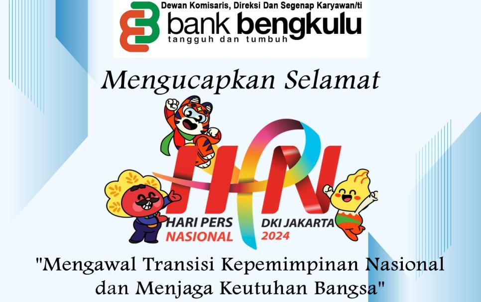 Progresiflines.com - Dewan Kamisari, Direksi dan Segenap Karyawan/I Bank Bengkulu mengucapkan selamat memperingati Hari Pers Nasional (HPN) Tahun 2024 yang di peringati pada hari Jumat tanggal 9 Februari 2024.