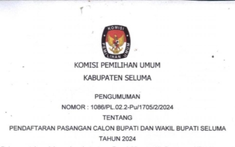 Ketua KPU Kabupaten Seluma Henri Arianda dalam Surat Pengumuman pada Sabtu, (24/8/2024) menginformasikan, bahwa untuk melaksanakan ketentuan pasal 95 ayat (1) peraturan KPU nomor 8 Tahun 2024 tentang pencalonan Bupati dan Wakil Bupati, KPU Kabupaten Seluma mengumumkan pendaftaran pasangan calon Bupati dan Wakil Bupati Seluma 2024.