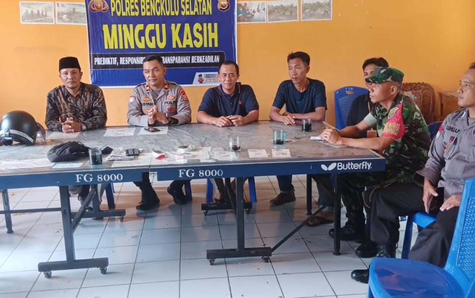 Bengkulu Selatan, Minggu (03/03/24) - Kapolres Bengkulu Selatan AKBP Florentus Situngkir SIK didampingi Kasat Binmas Iptu Kusyadi SH M Si dan personilnya menggelar acara Minggu Kasih yang dilaksanakan di desa Padang Niur Kecamatan Kota Manna Bengkulu Selatan dengan mengumpulkan warganya untuk mendengarkan keluh kesahnya. Minggu (03/03/2024)