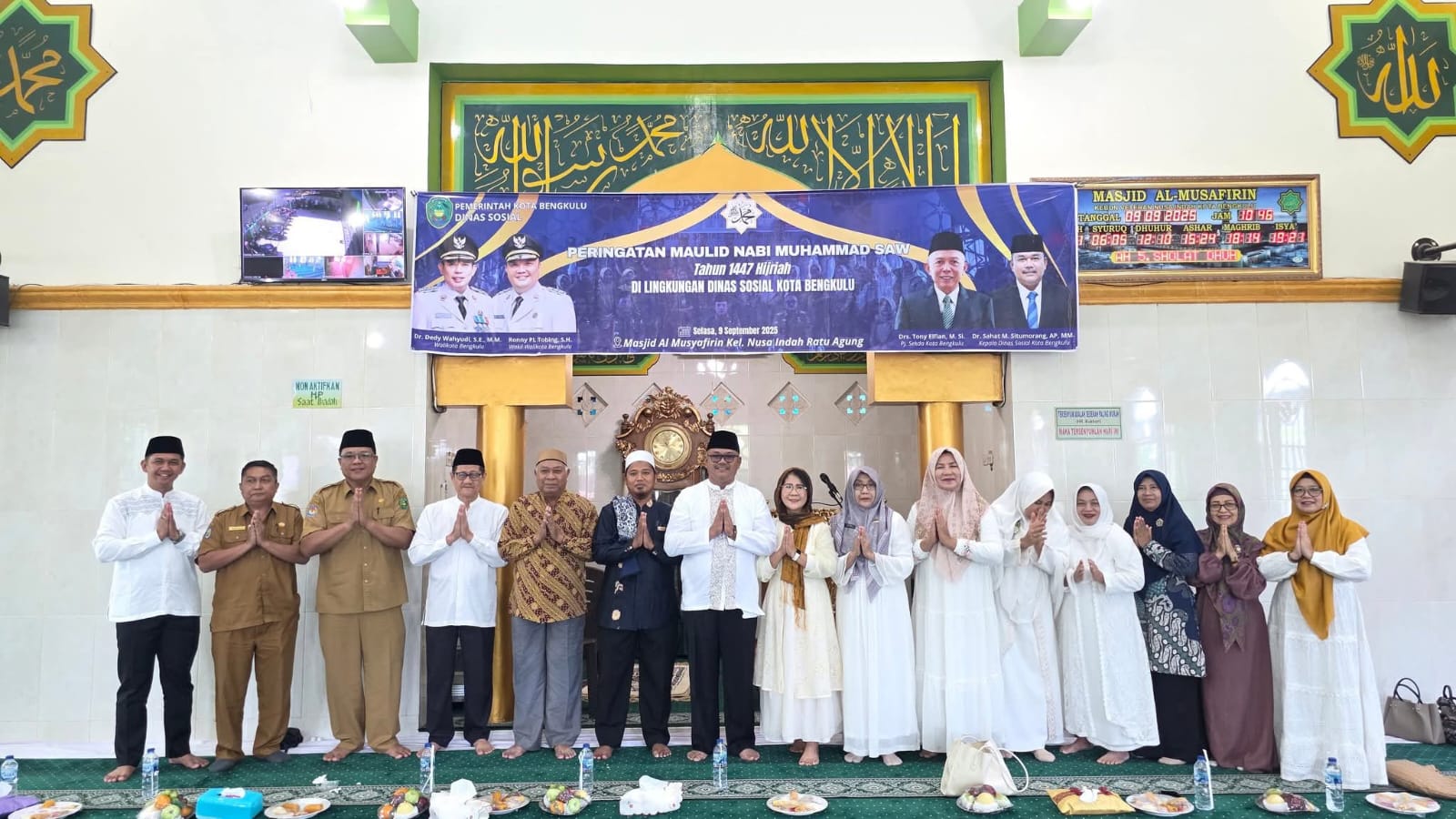 Bengkulu, Progresiflines.com - Pemerintah Kota Bengkulu melalui Dinas Sosial Kota Bengkulu menggelar Peringatan Maulid Nabi Muhammad SAW, yang di laksanakan di Masjid Almusyafir Nusa Indah Kota Bengkulu, Selasa (9/9/2025).