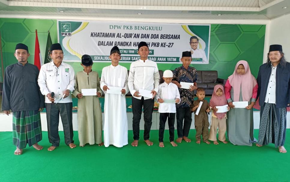 Progresiflines.com – Dalam rangka memperingati Hari Lahir (Harlah) ke-27 PKB, Dewan Pengurus Wilayah (DPW) Partai Kebangkitan Bangsa (PKB) Provinsi Bengkulu menggelar kegiatan khataman Al-Qur’an, istighosah dan pemberian santunan kepada anak-anak yatim dari Yayasan Al Jamil serta doa bersama yang digelar di Sekretariat DPW PKB Bengkulu, Jalan Tribrata, Kota Bengkulu, Rabu (23/7).