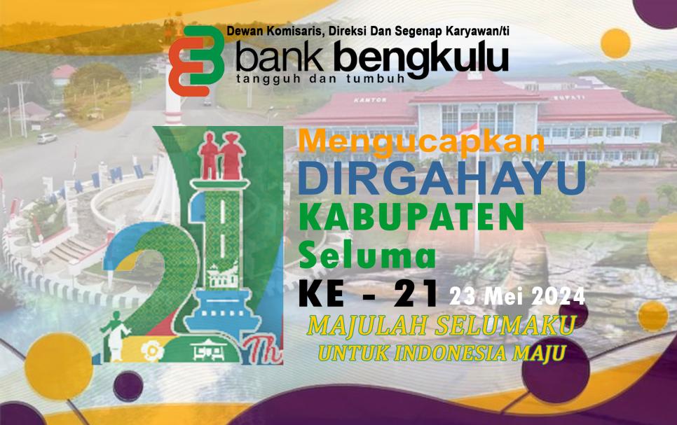 Bengkulu, Progresislines.com - Dewan Kamisaris, Direksi dan Segenap Karyawan/I Bank Bengkulu mengucapkan Hari Ulang Tahun (HUT) Kabupaten Seluma ke 21 Tahun, yang peringatannya pada tanggal 23 Mei 2024.