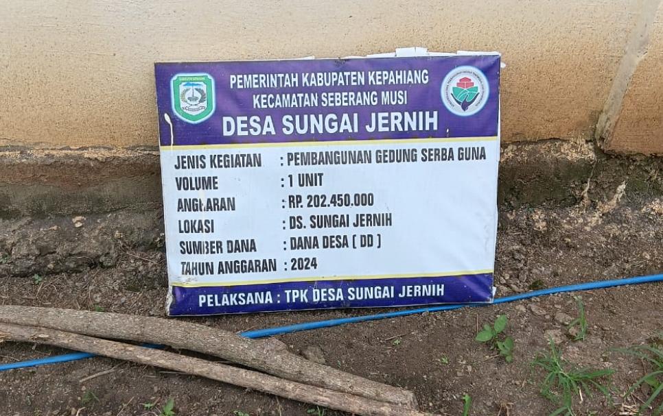Progresiflines.com - Pembangunan Gedung Serbaguna Desa Sungai jernih Kecamatan sebrang musi Kabupaten Kepahiang provinsi Bengkulu jadi pertanyaan, Sabtu 16/februari/2025.