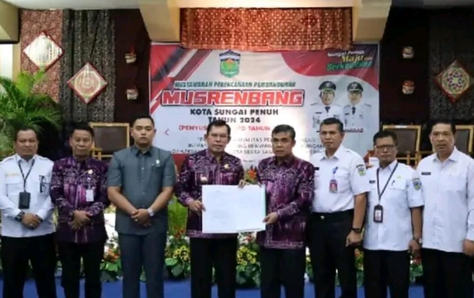 Selajutnya Wako Ahmadi bersama Pimpinan DPRD dan SKPD lingkup Pemkot Sungai Penuh melakukan penandatanganan berita acara Musrenbang Kota Sungai Penuh tahun 2024,dalam rangka penyusunan RKPD tahun 2025.(Stn).