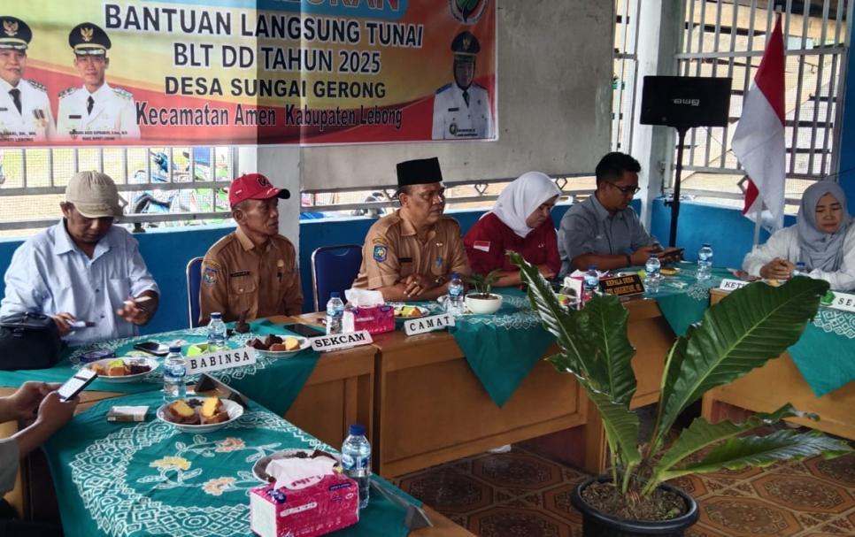 Progresiflines.com - Pemerintah Desa (Pemdes) Desa Sungai Gerong Kecamatan Amen Kabupaten Lebong Provinsi Bengkulu, melaksanakan penyaluran Bantuan Langsung Tunai (BLT) yang bersumber dari Dana Desa (DD) Tahun anggaran 2025 kepada 28 keluarga penerima manfaat (KPM) warga desanya, pada Selasa 3/6/2025 dilaksanakan Balai Desa. Penyaluran BLT DD diberikan kepada 28 KPM untuk periode Bulan Januari hingga Maret, kemudian dilanjut untuk bulan April hingga Juni, Denga besaran Rp. 300 Ribu per bulannya.